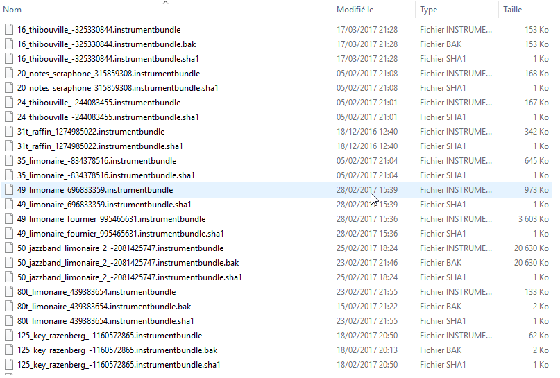 les fichiers .instrumentbundle sont des fichiers zip, contenant la définition d'un instrument complet (gamme, sons, définition ... ). les fichiers .bak sont des sauvegardes du fichier instrument, permettant en cas de perte de revenir à une version antérieur.
