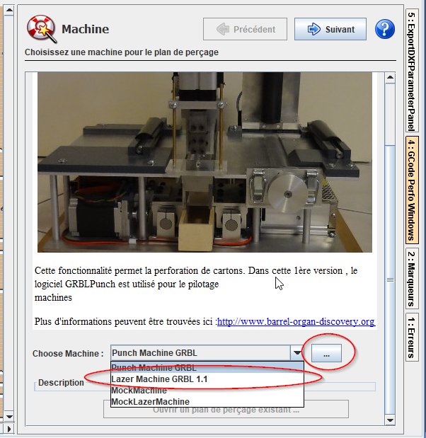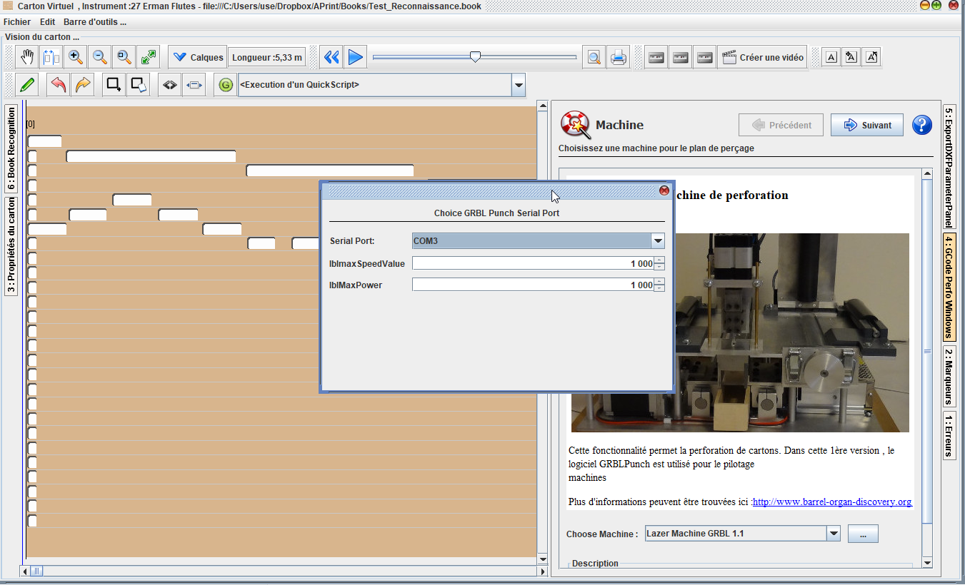 La perforation lazer est réalisée, à partir de la fenetre de perforation du carton, sélectionnez la machine connectée, l'utilisation de la Krunch Laser peut être réalisée avec "Laser Machine GRBL 1.1", le bouton à coté permet de régler : le port de connexion, et les paramètres de découpe.