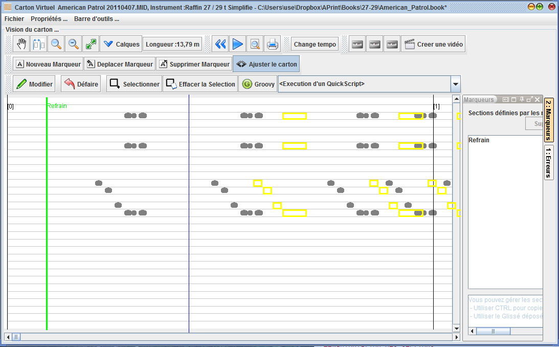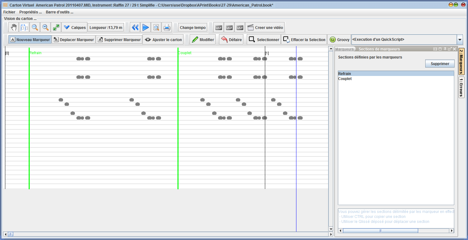 Il est fréquent de récupérer des fichiers midi, ou des numérisation ne contenant que des parties de fichiers midi, organisées en "Refrain" + "Couplet" etc ... , et que l'on doivent mettre bout à bout ces éléments pour reconstituer le carton final.