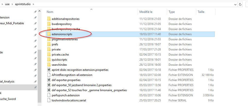 Le script définissant l'extension est placé dans le répertoire de contenu d'aprint studio, dans un sous répertoire nommé extensionscripts comme dans l'illustration ci dessous :