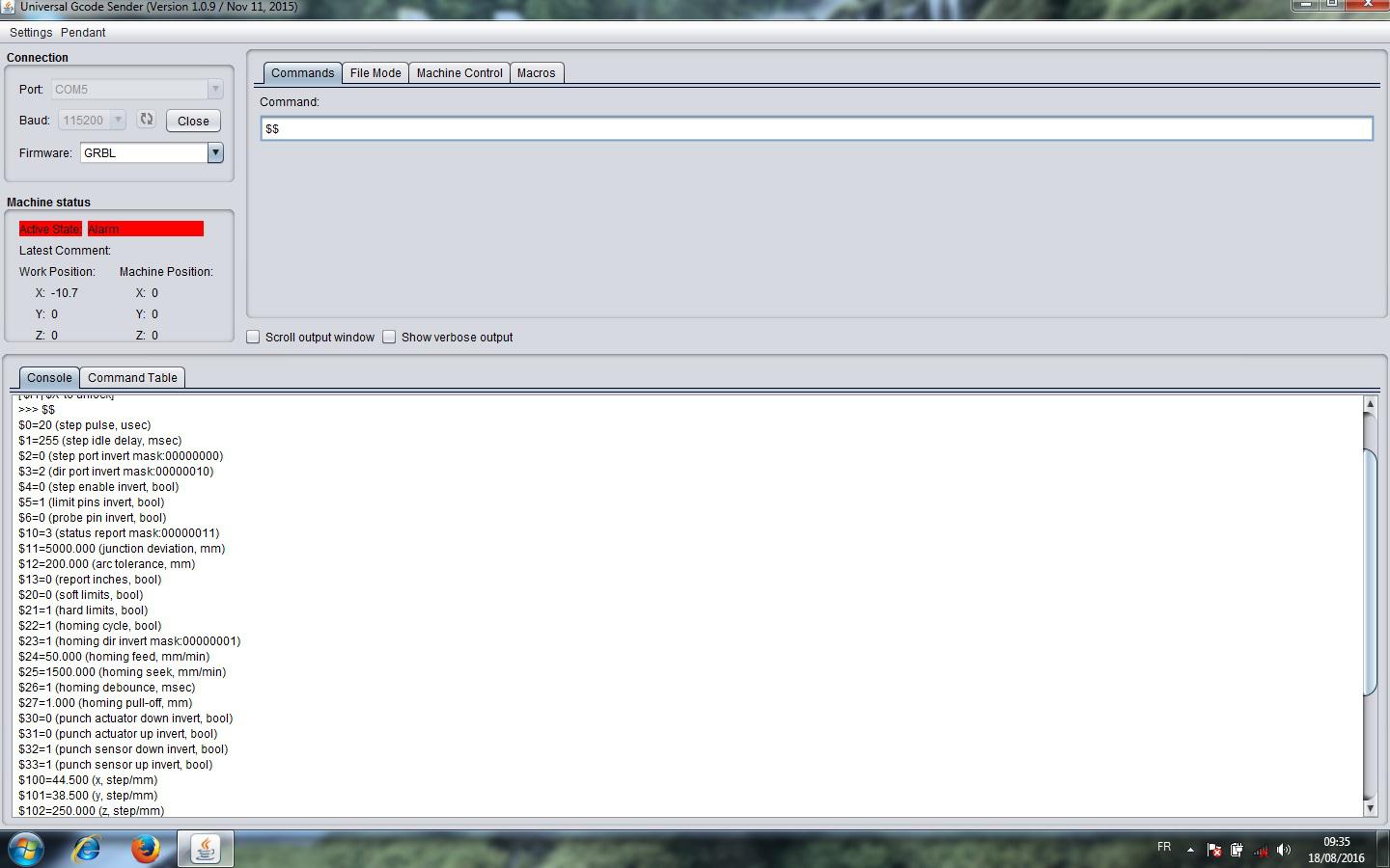 Cliquer sur le bouton « Open », sélectionner le port qui va bien. Vérifier que Grbl soit bien marqué dans la fenêtre « Firmware » Il faut maintenant rentrer les codes qui permettent à la machine de fonctionner. Dans l’onglet « Commands » on écrit $0 =20 puis cliquer sur « entrée » du clavier