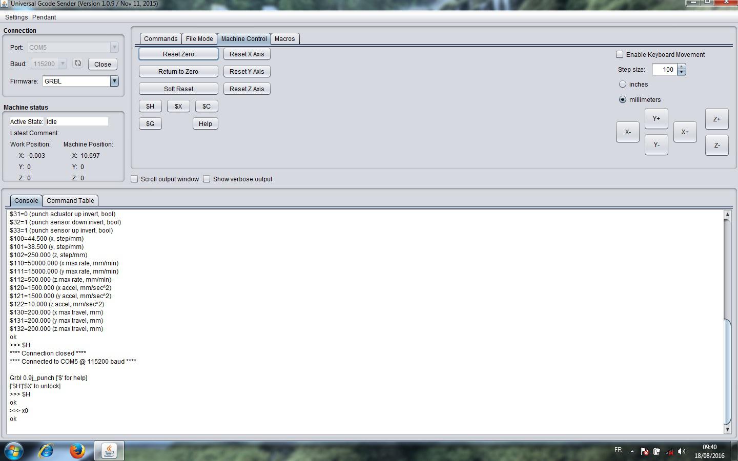 Mettre la machine sur « homing » avec $H Sur la page « Machine Control » taper par exemple 100 dans la fenêtre « Step Size »