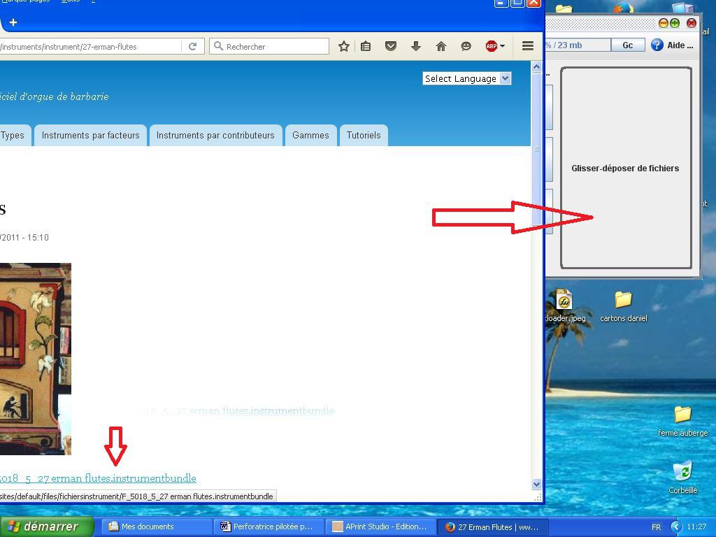 Clic gauche maintenu, glisser simplement cette adresse dans la fenêtre « glisser – déposer des fichiers » dans la fenêtre d’APrint. Il faudra bien sûr s’arranger pour que les deux pages soient visibles. Au bout de quelques instants vous aurez l’indication « instrument importé avec succès ».