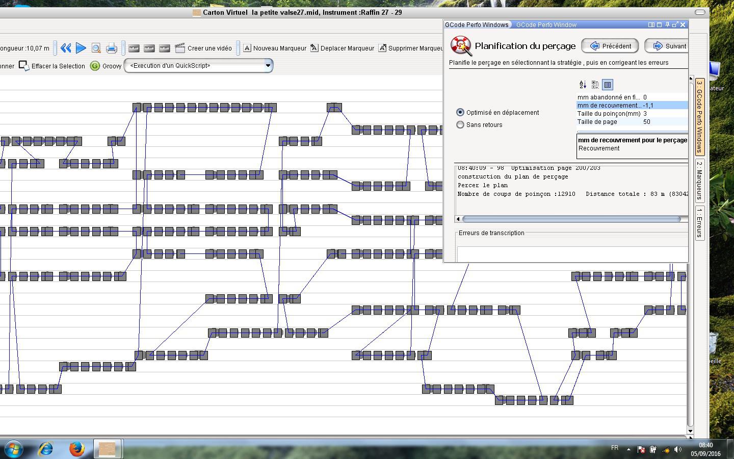 Une fois ces valeurs rentrées, il faudra cliquer sur «enter ou entrée» du clavier et le calcul se lancera automatiquement. A noter qu’à chaque changement d’une des valeurs, il faudra revalider par «enter». Le fichier midi est ainsi transformé en Gcode. On aura également le nombre de coups de poinçons ainsi que la distance parcourue par ce même poinçon.