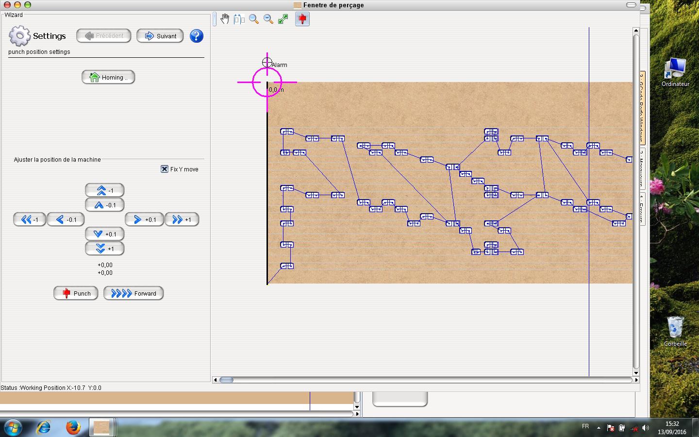 A la fin de ce calcul qui ne prend que quelques secondes, on arrive sur la page de perforation où l’on vous demande de mettre la machine sur le « homing » et d’aller sur la page suivante pour lancer la perforatrice. Ici vous aurez divers compteurs qui indiquent le temps ou longueurs restants ainsi que le bouton « pause » qui permet de mettre la machine en arrêt momentané.