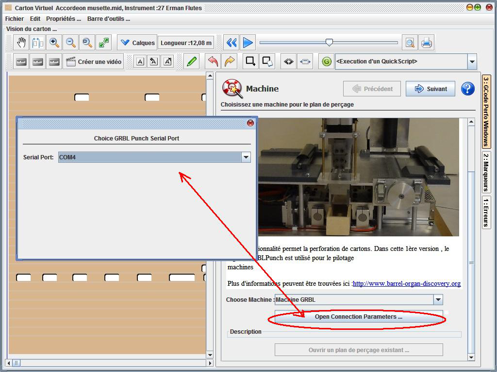 Il faudra toujours appliquer la procédure comme expliqué plus haut pour arriver à la page où l’on pourra sélectionner ou vérifier le port com qui permet au logiciel de communiquer avec la machine.