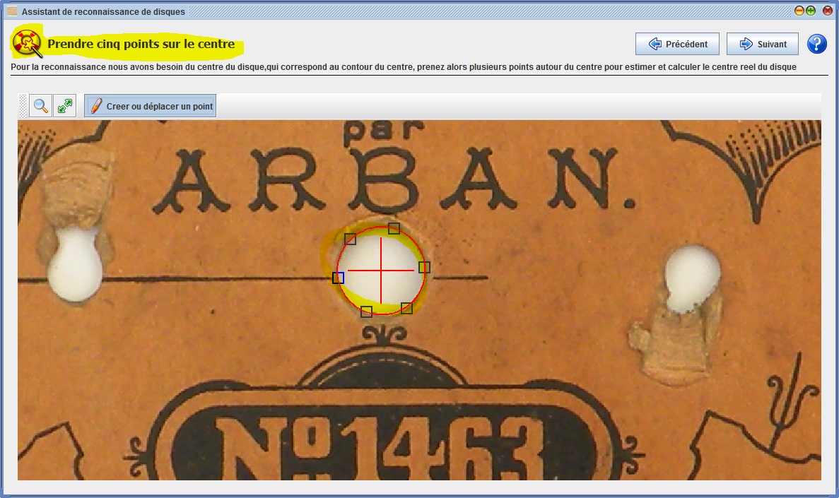 Le point important de cette étape est la connaissance du centre du disque, des outils permettent alors de prendre une serie de points sur une ellipse (qui peut être le trou de centrage ou une gravure sur le carton). Les points saisis permettent de calculer le centre d'une ellipse. Un minimum de 5 points est attendu, mais il est possible pour avoir plus de précision d'en saisir plus.