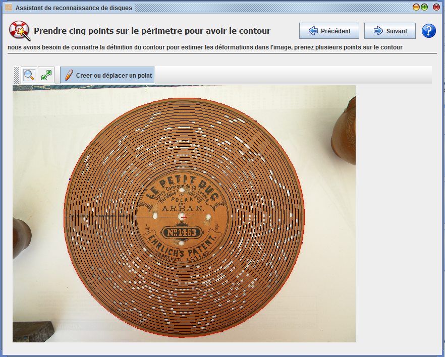 La seconde étape de l'assistant demande à préciser le contour du disque. Ceci est réalisé de la même façon que l'étape précédente, c'est à dire en saisissant une serie de points sur le contour du disque. Il se peut que la photo soit déformée et ne permette pas directement de pouvoir correctement lire les trous (mal qualifiés). La connaissance du contour permet ainsi de mieux prendre en compte les déformations et redresser au mieux la photo pour la mettre à plat.