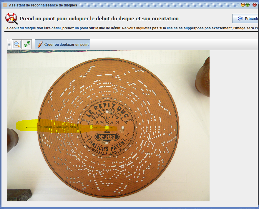 Cette nouvelle étape demande à définir le debut du carton (emplacement où le disque commence sa lecture). La saisie d'un seul point est nécessaire sur le contour, comme indiqué sur la photo en jaune.